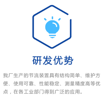 我厂生产的节流装置有:标准孔板,ISA1932喷嘴,长颈喷嘴和文丘里管等几十个品种。其技术条件符合中华人民共和国国家标准GB/T2624及国际标准ISO5167的规定。我厂除生产上述标准节流装置外,还生产目前国内普遍应用的各种特殊流件,如1/4圆喷嘴、圆缺孔板、环形孔板、双重孔板、内藏孔板、V锥形流量计、楔形流量计、插入式多喉径流量计、阿牛巴流量